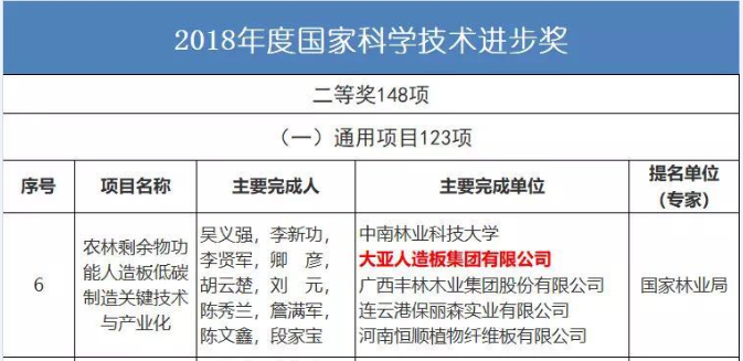 1月8日上午,2018年度国家科学技术奖励大会在北京人民大会堂举行。习近平、李克强、王沪宁、韩正等党和国家领导人出席会议活动。习近平等为获奖代表颁奖。李克强代表党中央、国务院在大会上讲话。大亚人造板集团有限公司参与的“农林剩余物功能人造板低碳制造关键技术与产业化”项目获2018年度国家科学技术进步二等奖,实现了大亚人造板集团历史上国家科学技术进步奖零的突破。