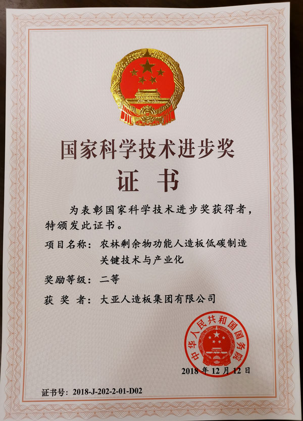 大亚人造板集团作为第二完成单位,与中南林业科技大学、广西丰林木业集团股份有限公司、连云港保丽森实业有限公司、河南恒顺植物纤维板有限公司共同完成该项目。针对人造板易燃烧、防潮性能差、释放甲醛以及生产效率低、能耗高等技术难题,项目研发了农林剩余物功能人造板绿色胶黏剂及其高效制备、多元体系坯料分级节能快构、高效节能成形技术及核心装备,构建了农林剩余物功能人造板低碳制造技术体系,为我国人造板产业结构优化升级及行业技术进步提供了重大技术支撑,对保障木材安全、生态安全,实现林产工业绿色可持续发展具有重要意义。