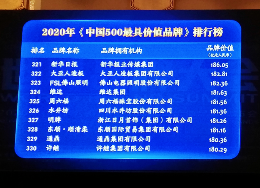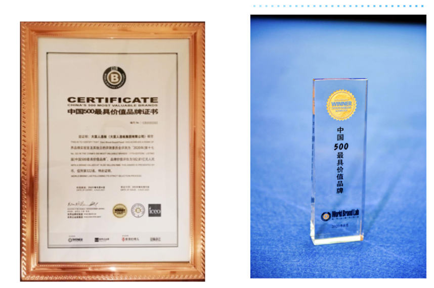 8月5日,由世界品牌实验室(World Brand Lab)主办的(第十七届)“世界品牌大会”在北京举行,会上发布了2020年《中国500最具价值品牌》分析报告。在这份基于财务数据、品牌强度和消费者行为分析的年度报告中,圣象以572.59亿元人民币品牌价值再次入选,荣膺第102位,继续领跑中国家居行业;大亚人造板以182.81亿元品牌价值蝉联中国人造板行业榜首,品牌排名322位,价值增幅15.2%。