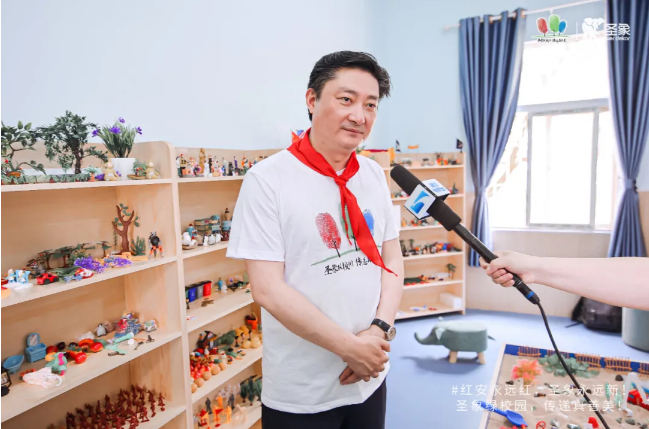 △董事长在圣象捐赠的“开心教室”接受媒体采访,圣象本次除了捐赠儿童用品之外更是为孩子们搭建了“开心教室”(由整装设计+事业部以及商用空间事业部提供整体空间设计以及安装施工)以及修缮操场等,为孩子们提供一个绿色的人居生活空间,并特为孩子们办了一个61游园会。