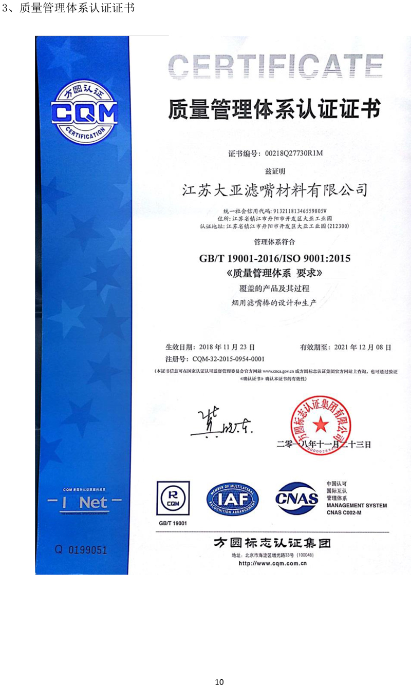 江苏大亚滤嘴材料有限公司企业质量信用报告